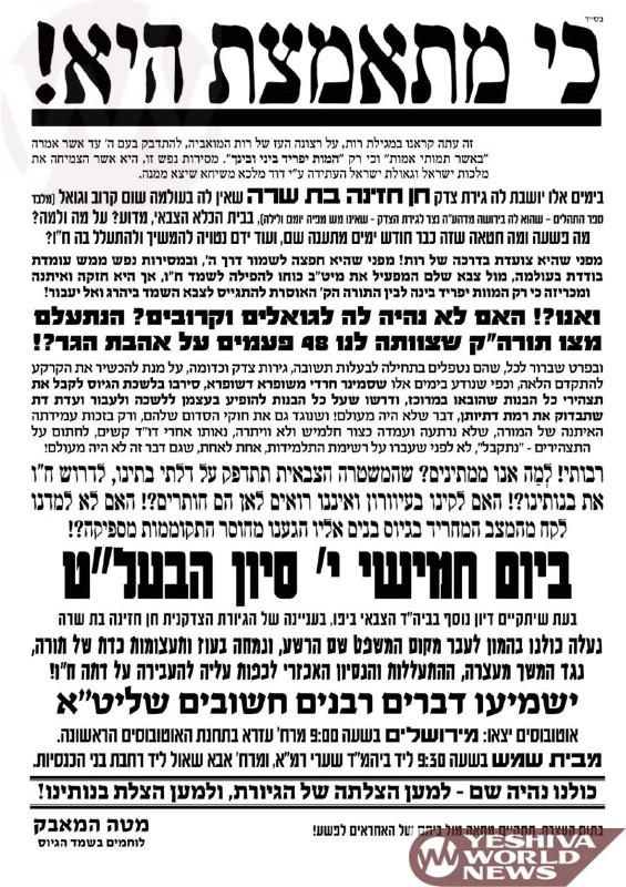 On Thursday, 10 Sivan, buses will leave Jerusalem at 9:00AM and take protesters to the Jaffa Military Courthouse where proceedings continue against a female convert who is frum, but not recognized by such as the IDF and therefore drafted for military service. Buses will also be taking protesters from Beit Shemesh, calling on the tzibur to participate “before they come to our homes and take our daughters for IDF service R”L.