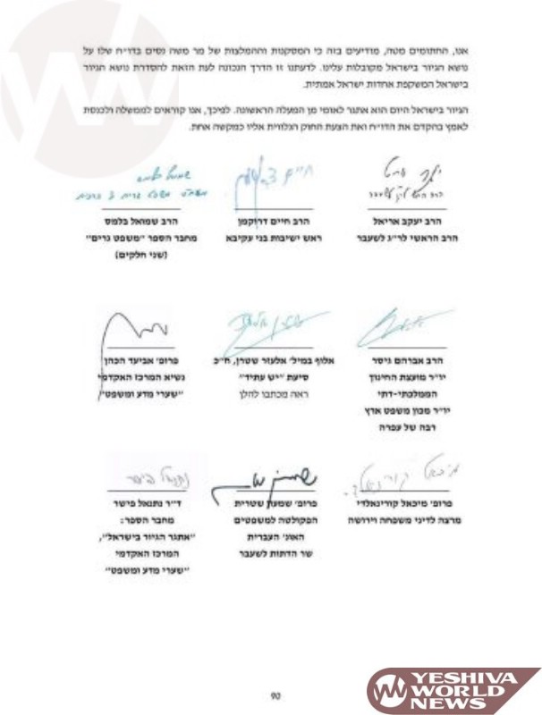 On Sunday, 20 Sivan, former Likud minister Moshe Nissim is scheduled to submit his recommendations for giyur to Prime Minister Binyamin Netanyahu. The recommendations of this committee are expected to bring an end to the crisis surrounding giyur. HaRav Yaakov Ariel Shlita, who was among the rabbonim signing approval of the recommendations, has removed his support, explaining he was duped. He told persons close to him that the version he was shown “was inaccurate”.