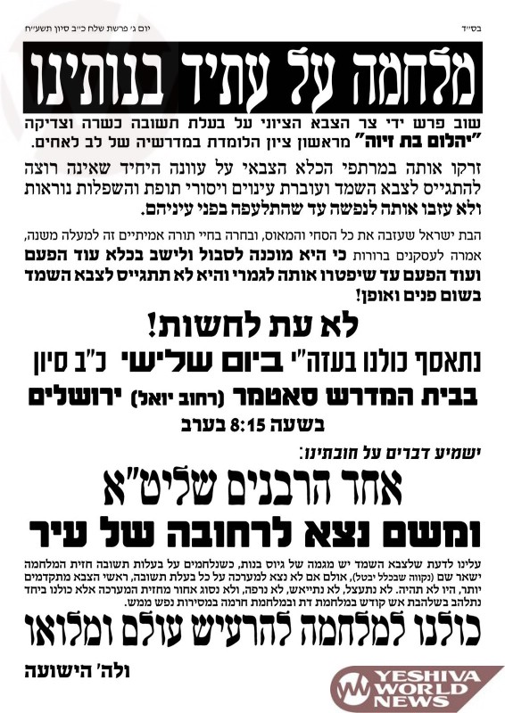 “War on the future of our daughters” is the banner of the pashkavil seen in Jerusalem ahead of the Tuesday evening 22 Sivan event in the Satmar Beis Medrash on Yoel Street in Jerusalem. The event begins at 20:15.
