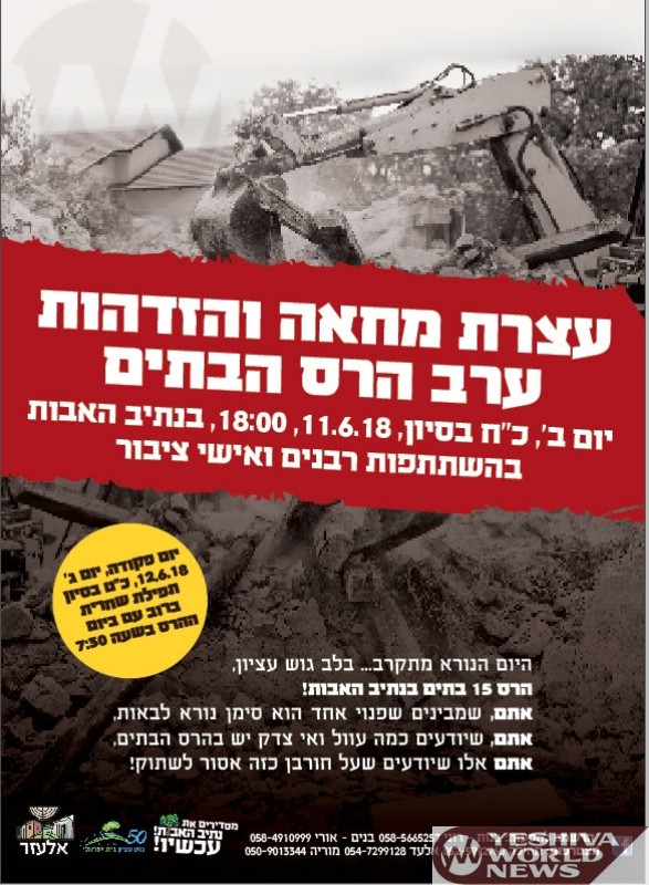 A protest rally is set for Monday, 28 Sivan at 6:00PM at Netiv HaAvot, a last cry by rabbonim and public officials for state officials to come to their senses and prevent the destruction.