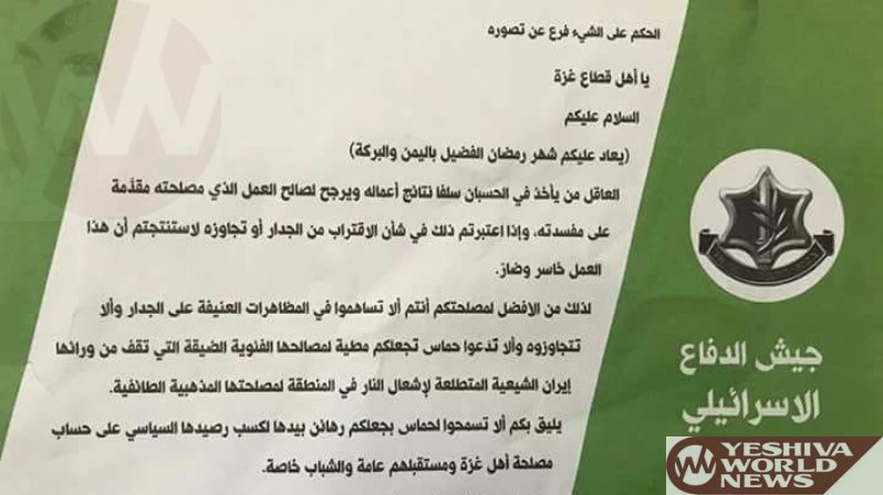 The leaflet warns that approaching the border fence is liable to be “severely detrimental”, and that the IDF will not allow “damage to the fence, or attempts to carry out terror attacks against Israeli civilians and security forces.”