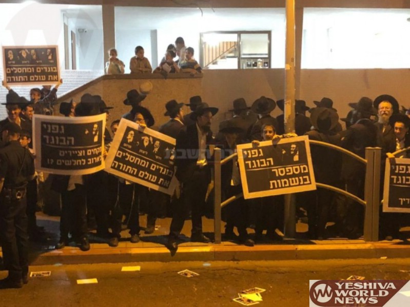 Participants in the event recited Tehillim, and carried signs including; “Gafne a traitor”, “Gafne betrays neshomos”, “you’re a murderer and destroy families – it’s all because of you Gafne!” and more. Simultaneously, a few streets away in Bnei Brak, a number of sikrikim protested outside the home of the secretary of the Degel Moetzas Gedolei Torah, Rav Mordechai Sern.
