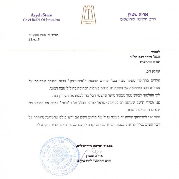 The rav concludes he turns to the minister in the name of “hundreds of thousands of Israelis of all walks of life to whom Shabbos is close to their hearts”.