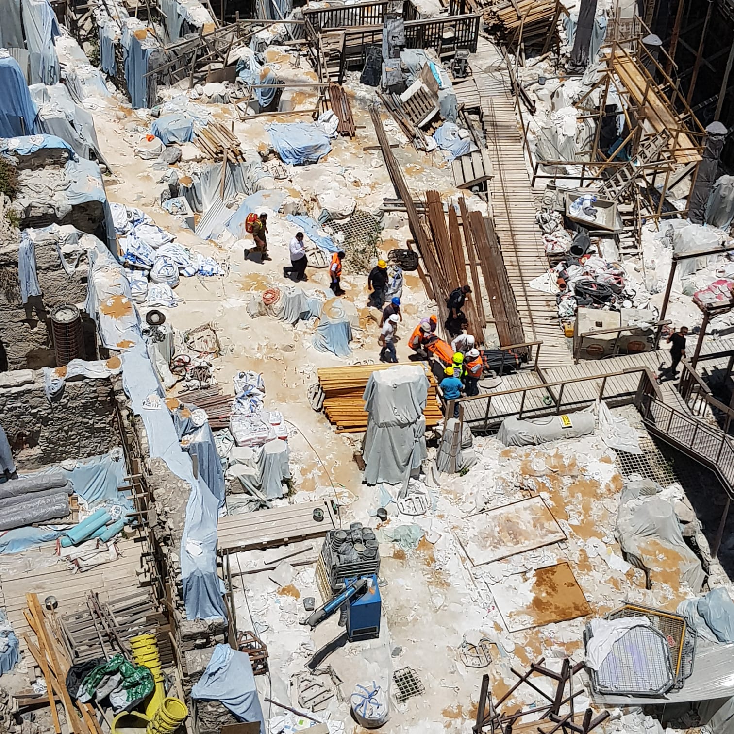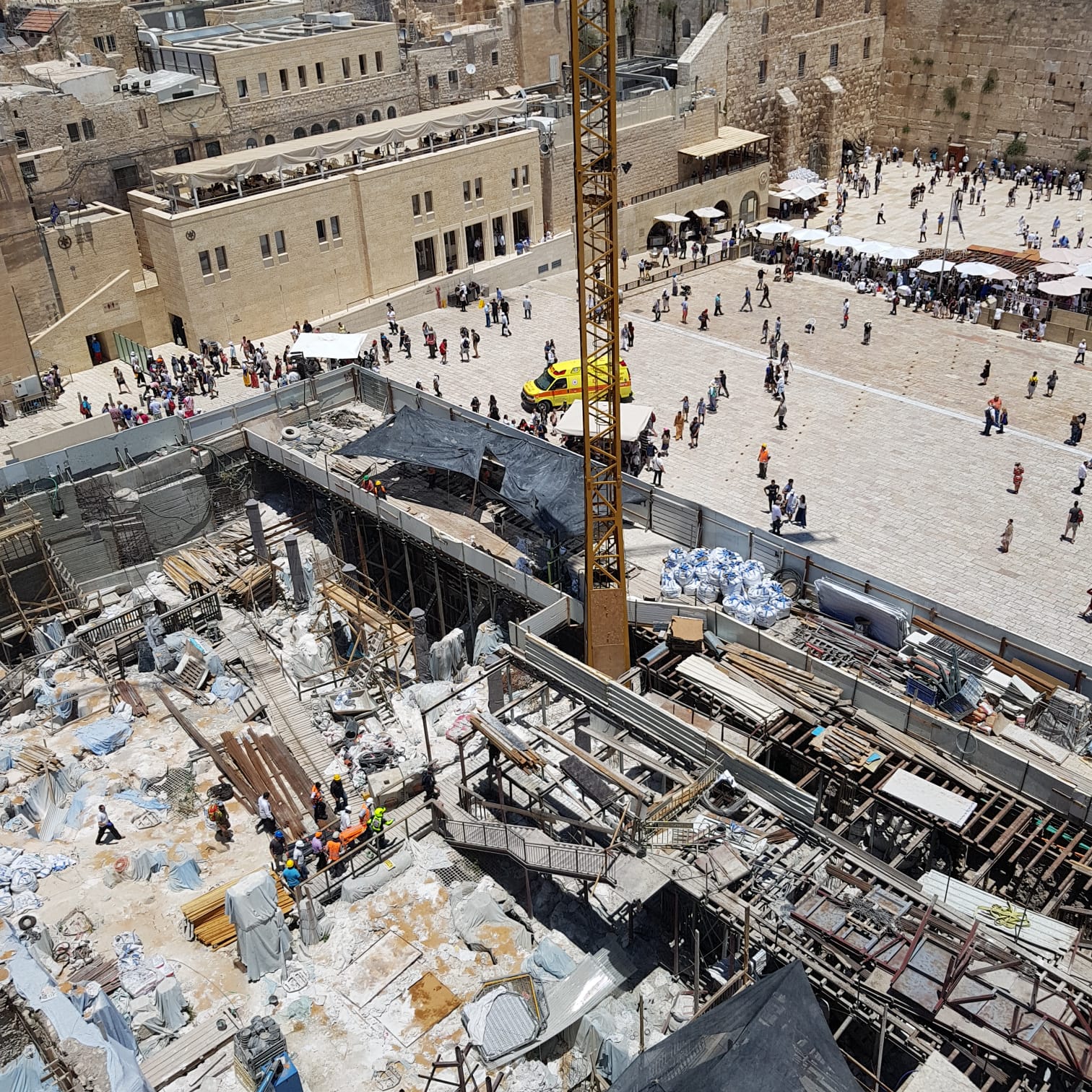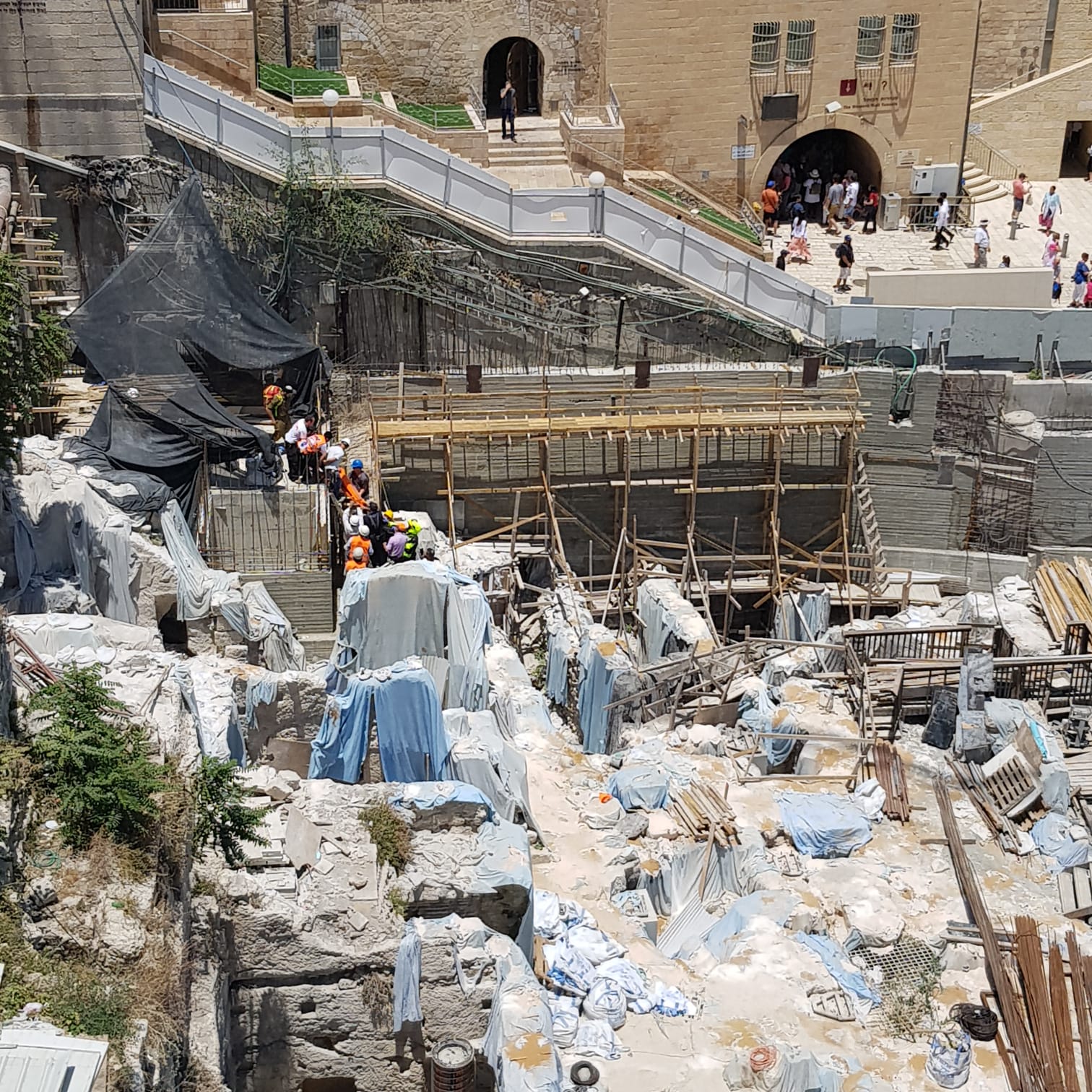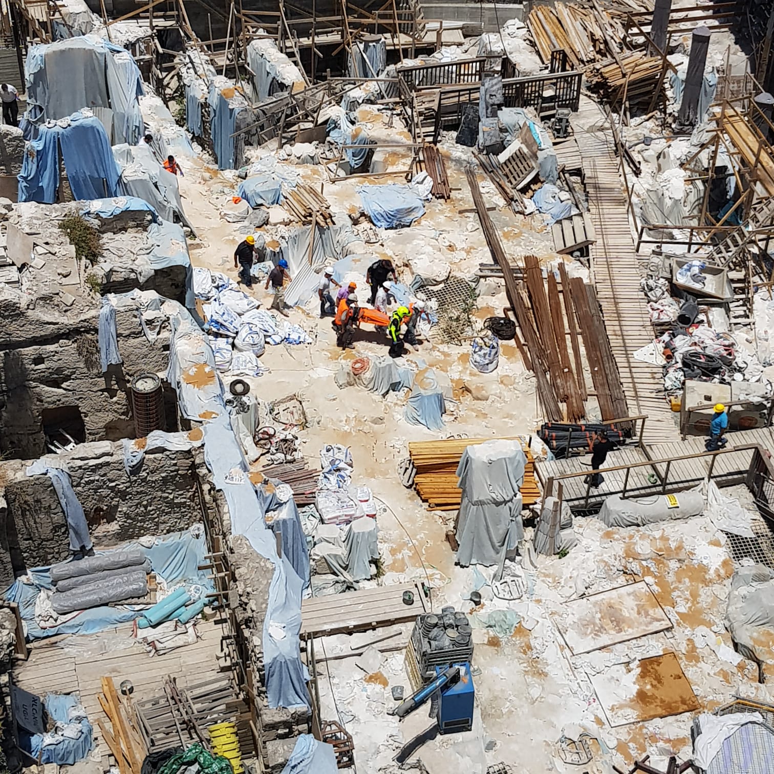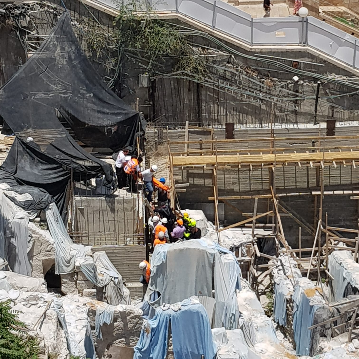 A construction worker was injured in a fall at the Kosel on Monday, 12 Tammuz. Emergency Medical Service personnel treated and prepared the victim for transport, who was carried off the scene immobilized on a backboard.