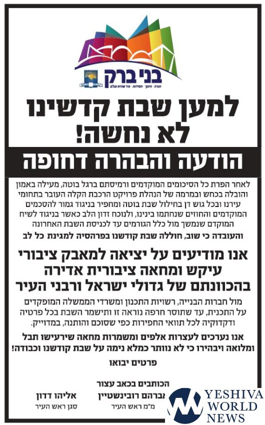 The rav went on and he addressed his words to the new owners of the Danya Cebus Company, a Shomer Shabbos Jew, and said that many wealthy persons who were mechalel Shabbos in Tel Aviv paid a high price, and there are many examples and that one way or another, they have the ability to stop this, no matter how difficult it may be, calling on the owner(s) in the name of the Torah City, and to remember the brachos received for those who observe and protect the Shabbos.