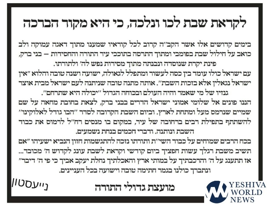 The call from the Admorim Shlita follows an announcement from Bnei Brak City Hall, that it too is officially joining the fight, citing it will not tolerate the ongoing Chilul Shabbos in the Torah city.