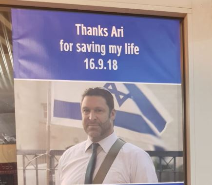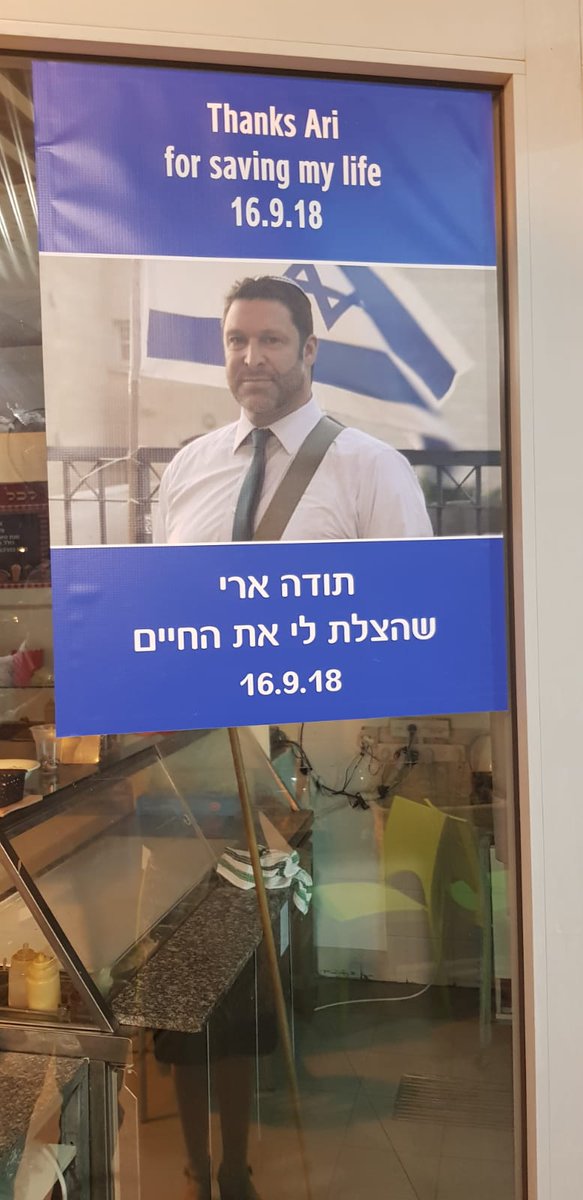 Ari’s brother Hillel shared the attached photo on twitter, showing a sign hung by a female employee at the falafel store in Gush Junction Shopping Center, thanking Ari for saving her life.