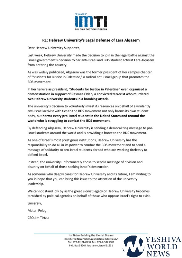 The Zionist organization Im Tirtzu sent letters to dozens of Hebrew University donors, calling on them to not ” stand idly by” while the university continues to provide legal support to Lara Alqasem.