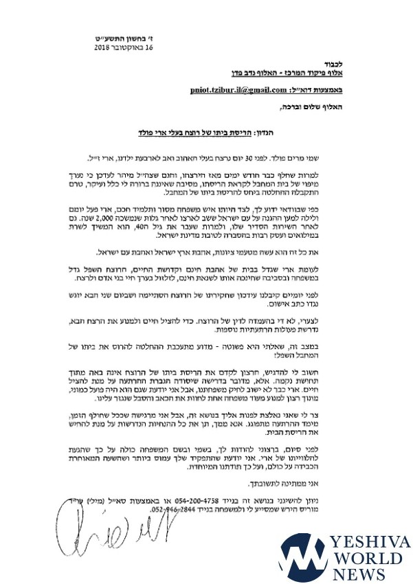 “I have a simple question,” wrote Fuld in a letter addressed to head of the IDF Central Command Major-General Nadav Padan, “Why is the decision to demolish the home of the depraved terrorist being delayed?”