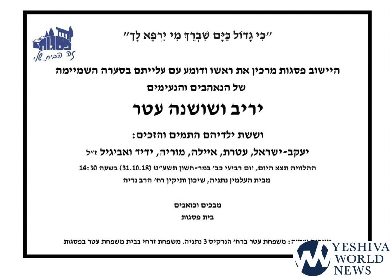 Killed in the head-on accident were Yariv Atar (father – 45), Shoshi (mother – 47), Yaakov Yisroel (12), Ateres (11), Ayala (9), Moriah (7), Yedid (5) and Avigayil (3).