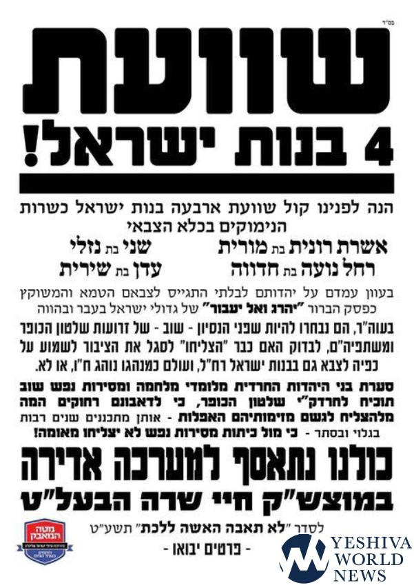 The Action Committee is announcing an event will take place this coming Motzei Shabbos, Chayei Sara, on behalf of four frum girls who refuse to serve in the IDF, and as a result, they are sitting in an IDF prison.
