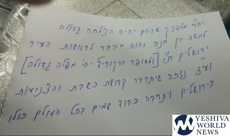 Today, election day, Hagaon HaRav Chaim Kanievsky had the following Tefillah on his Gemara all day: