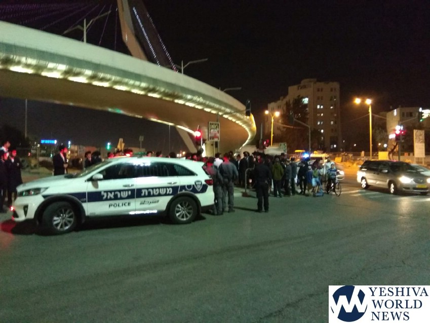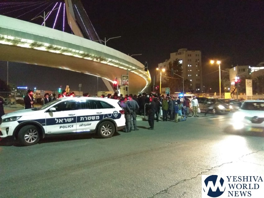 The Peleg Yerushalmi held a protest at Jerusalem’s Chords Bridge on Tuesday night, disrupting traffic in the area.