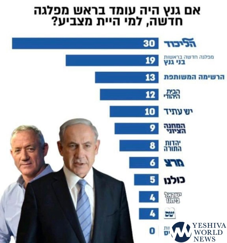 The results of the poll also show PM Netanyahu can easily form his new coalition with Gantz, Kulanu, Shas, and Yahadut Hatorah, if the chareidim remain united. However, this would be greatly be dependent on the draft law, as Gantz, a former IDF Chief, is not likely to be too quick to accept an entirely ‘chareidi-friendly’ version of the bill. However, the bill, as things appear today, may be decided by the High Court of Justice so it will not be an issue.