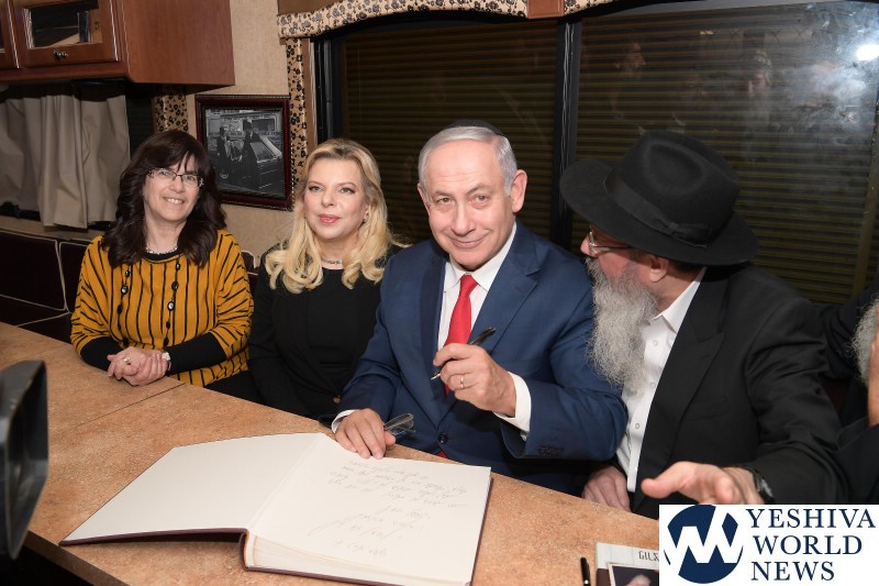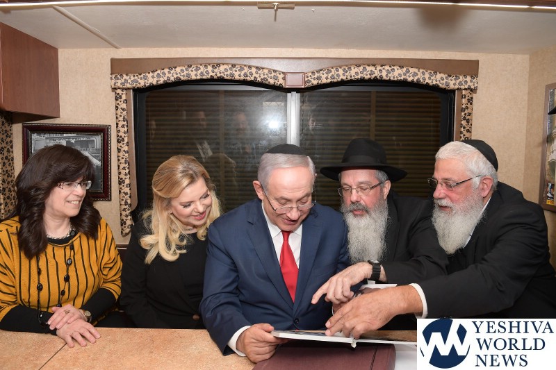 Prime Minister Binyamin Netanyahu, together with his wife and First Lady Sara Netanyahu attended a special ceremony in which a Mezuzah was affixed to the Chabad mobile “Mitzvah tank” that is located on the grounds of the Prime Minister’s residence in Jerusalem.