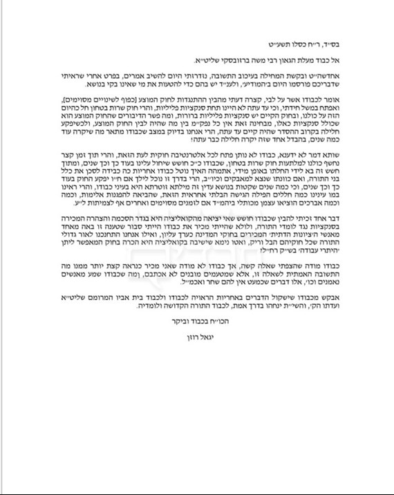 There is anger among the leaders of the Slonim chassidus after letters were leaked to the media, reported by BeChadrei Chareidim. One letter was from Rosh Yeshivas Ohr Yisrael HaGaon HaRav Yigal Rozen, who sent a letter to Rosh Yeshivas Slonim HaGaon HaRav Moshe Brazovsky, who responded with his letter. Slonim has now told BeChadrei they will no longer respond to letters for fear they will find their way to the media.