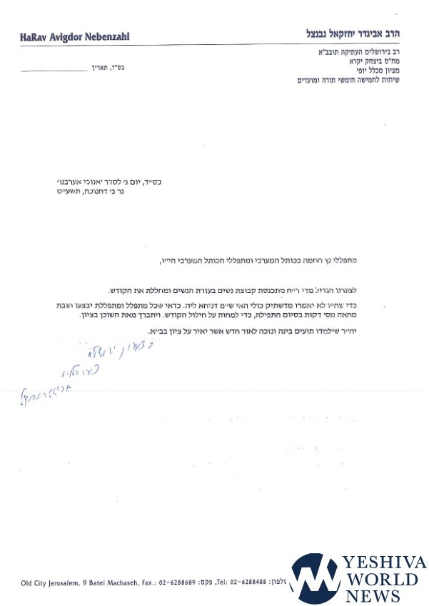The rav’s letter is addressed to persons davening neitz as well as other mispallalim at the Kosel as well.
