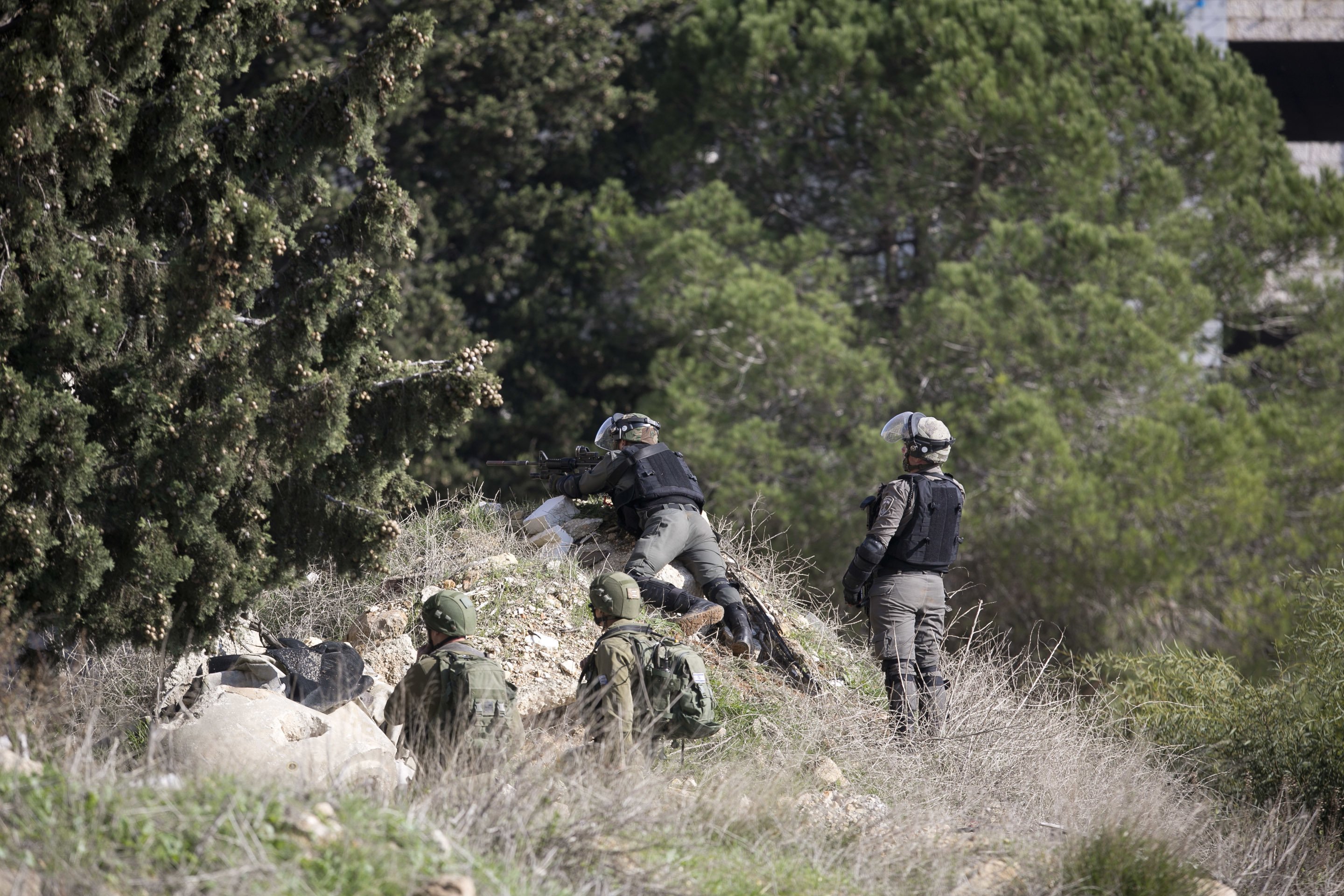 Palestinians clashed with Israeli troops across the city of Ramallah as security forces scoured the area for the suspected gunmen. Medics said six Palestinians were wounded.