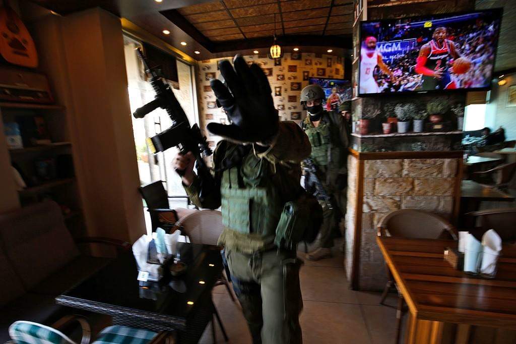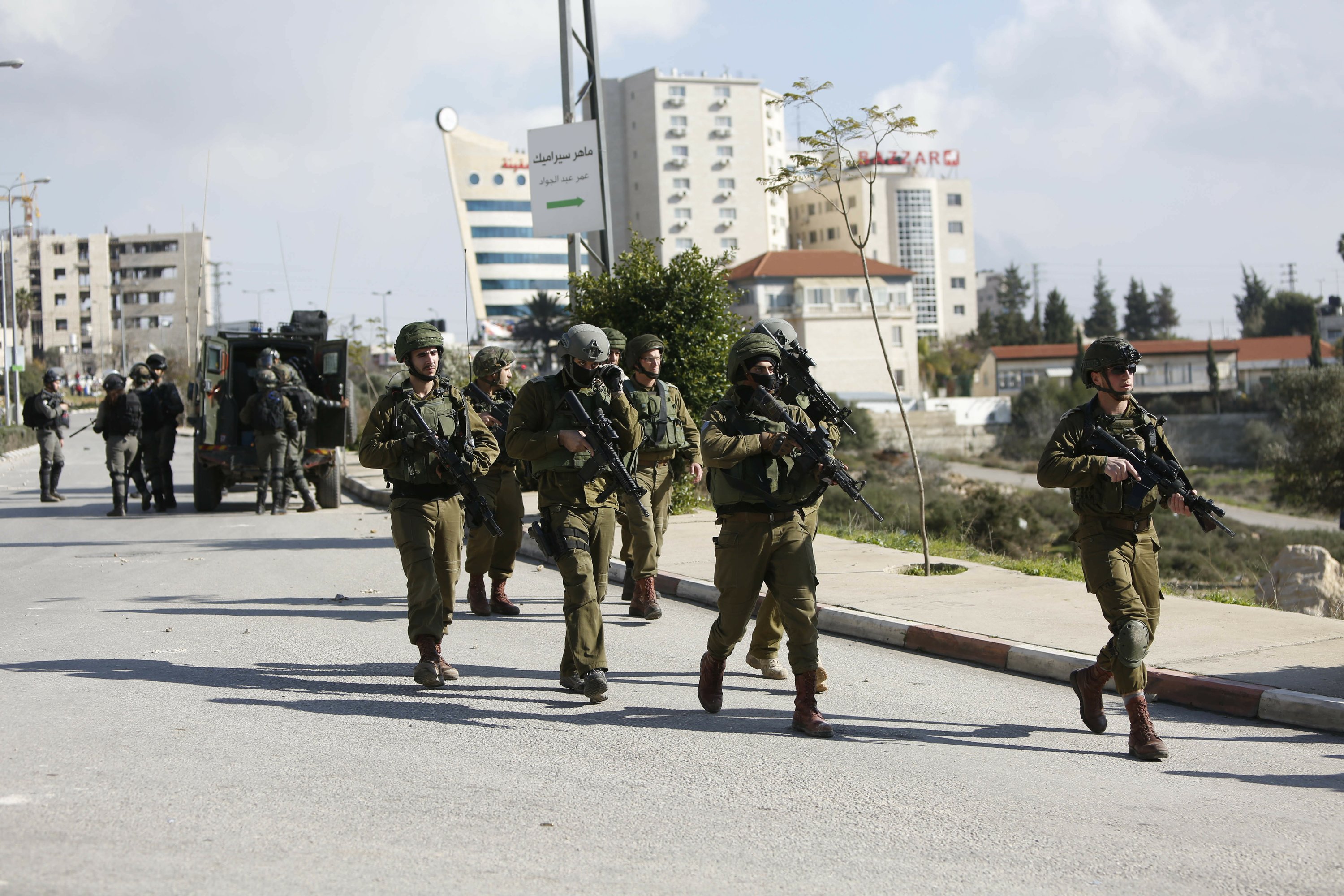 Israeli military forces carried out a series of raids in Ramallah on Monday, bursting into stores and offices of the official Palestinian news agency in a manhunt for terrorists who shot seven Israelis outside a Jewish settlement the day before.