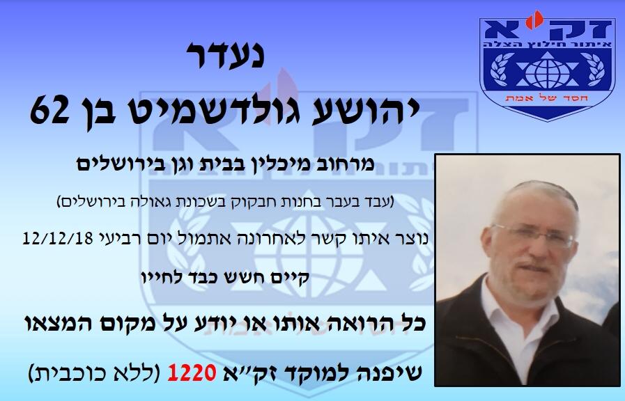 Anyone with information on his whereabout is urged to call ZAKA at 1220 (without an asterisk).