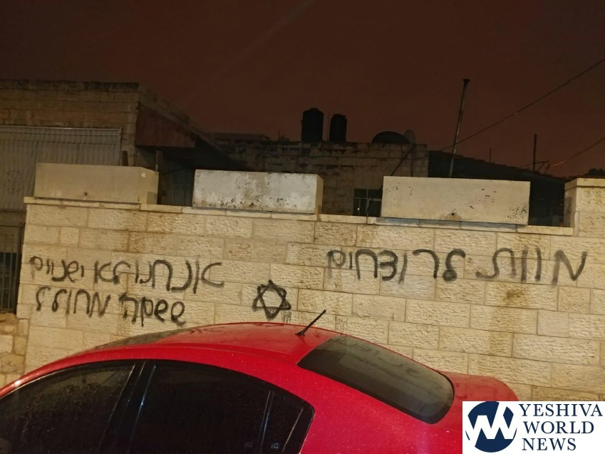 Jerusalem police are investigating hate graffiti found painted on a public wall on Amichai Feiglin Street in the northern Jerusalem neighborhood of Pisgat Ze’ev. In addition, police report “damage to the tires of a number of nearby parked vehicles”, which generally means the tires have been slashed.