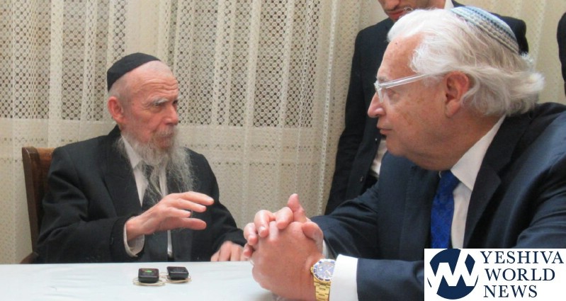 Friedman then visited Hagaon Harav Gershon Edelstein. Bechadrei Chareidim reports the Ponovezh Rosh Yeshiva asked the ambassador about the recent decreees against Yeshiva chinuch in New York, and asked Friedman if he could get involved. The Rosh Yeshiva said: “הזכות הגדולה ביותר למדינה, זה שלומדים בה תורה, על זה העולם עומד”
