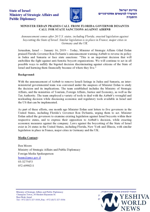 Minister of Strategic Affairs Gilad Erdan praised Florida Governor Ron DeSantis’ announcement warning Airbnb to reverse its policy in Judea and Samaria or face state sanctions: “This is an important decision that will embolden the fight against anti-Semitic boycott organizations. We will continue to act in all possible ways to nullify the bigoted decision discriminating against citizens of the State of Israel and harming them financially because of where they live.”