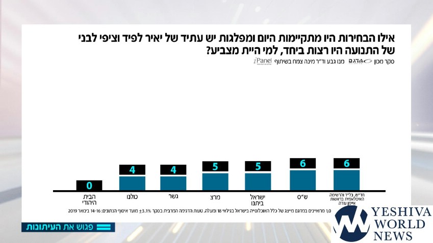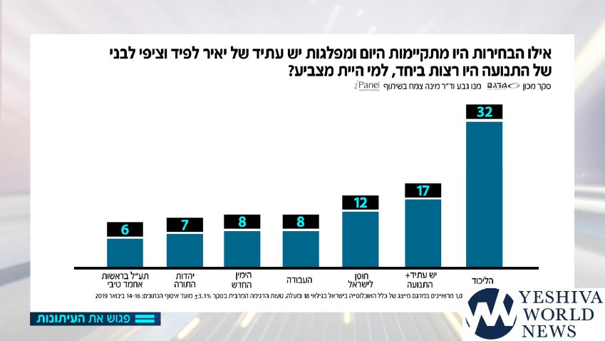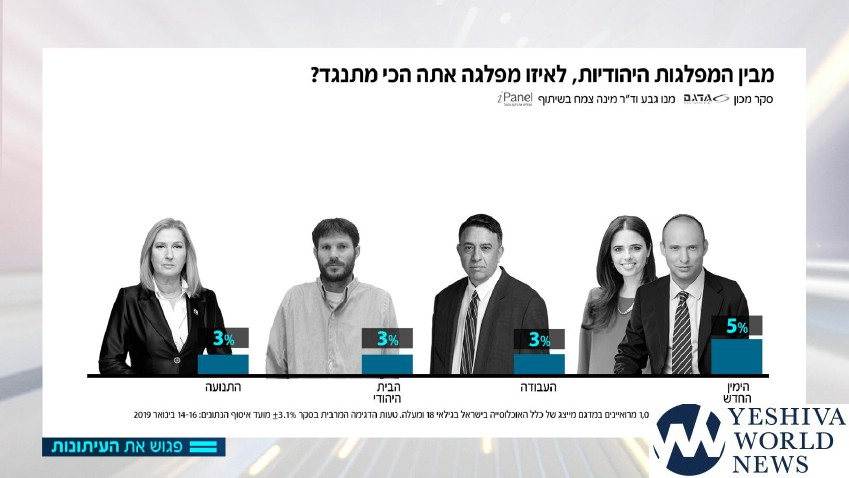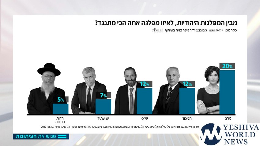 The latest election poll was released on motzei Shabbos by the Meet the Press program, a poll taken among 1007 respondents who represent eligible Israeli voters, 18 and older. Respondents were polled between January 14-16, 2019. The poll was conducted by Midgam Institute headed by Dr. Mina Tzemach in cooperation with iPanel. Margin of error is +/- 3.5%.