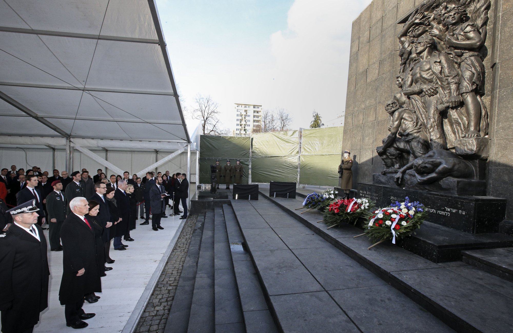 Powerful moment as Israeli PM @netanyahu, Polish PM Morawiecki, & @VP lay a wreath at the Monument for the Warsaw Ghetto Uprising. pic.twitter.com/Pao22PqatS