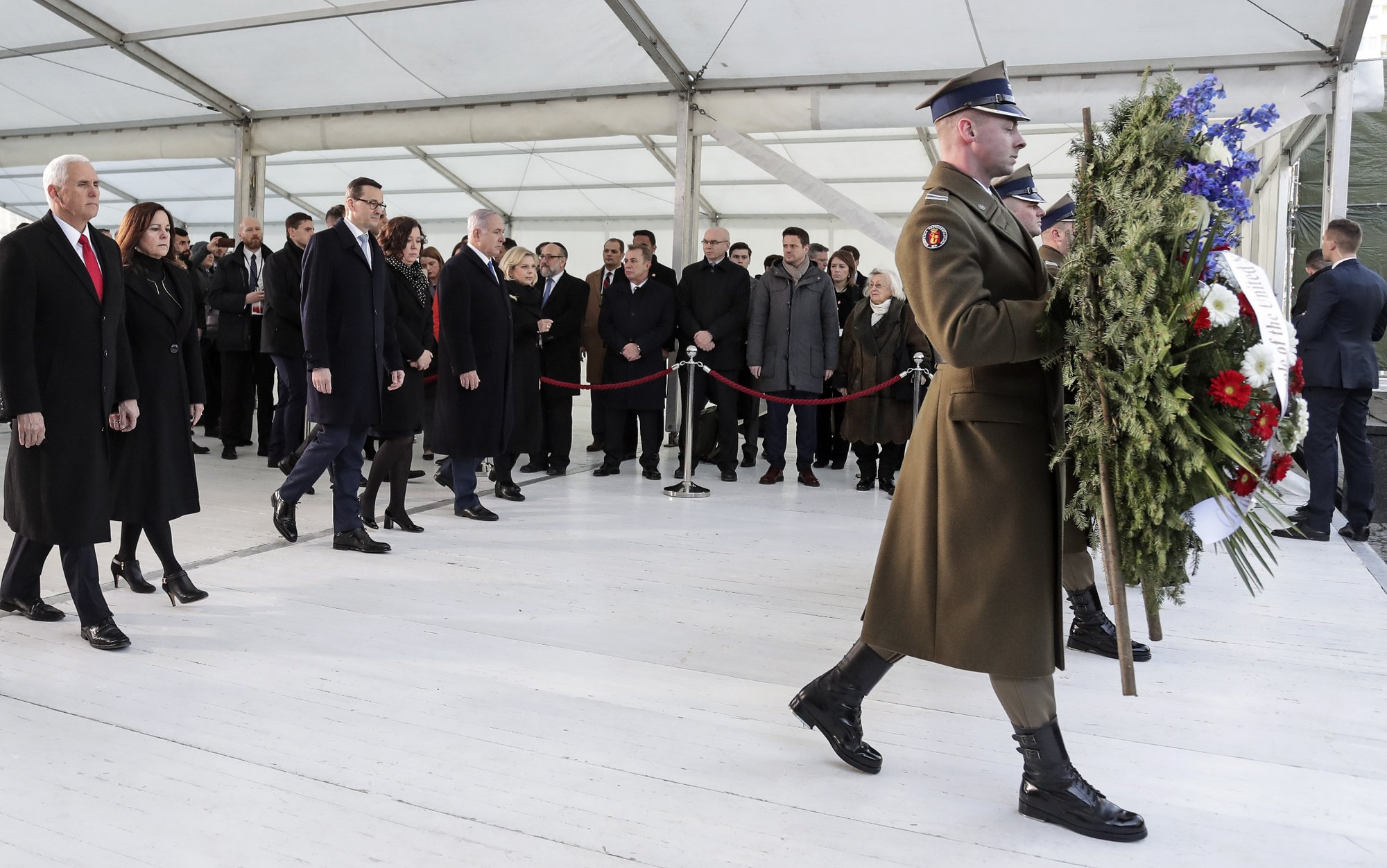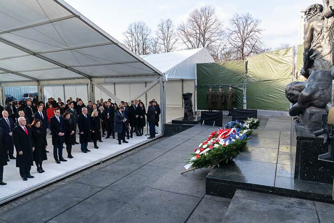 Pence first joined prime ministers Benjamin Netanyahu of Israel and Mateusz Morawiecki of Poland in honoring the wartime Jewish insurgents who rose up against Nazi German forces in the Warsaw Ghetto uprising of 1943.