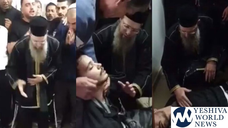 In the beginning of the video, a young man who appears to be in a troubled mental state is seen sitting in a chair, surrounded by the group who are reciting Pesukim from Tehillim [Yoshev B’seiser]. The Mekubal places his finger in a circular motion on the young man’s stomach.