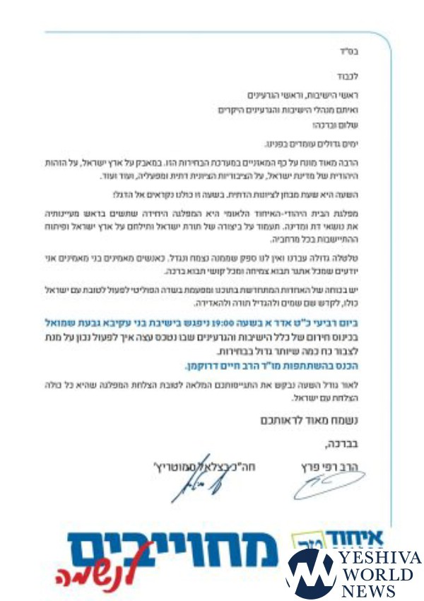In a letter sent by the two, they claim before the rabbonim, “we have big days before us, and it is a critical time for the religious Zionist community, a time we must all unite under one flag”, calling on the rabbonim to speak with their talmidim, families and community, to vote for Bayit Yehudit, towards earning additional votes in the upcoming election for 21st Knesset.