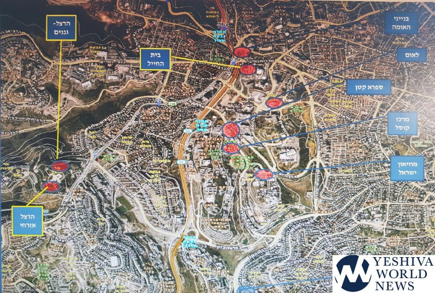 From eastern gallery at the Teddy Stadium, Mt. Herzl Square and the Shaare Zedek Hospital parking lots to Gan Sacher Park.