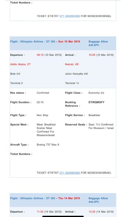 Speaking to BeChadrei Chareidim, Mozeson who is a Gerrer Chosid said “We were supposed to fly from Israel to Addis Ababa on Motzei Shabbos and from there to Nairobi, Kenya. Because of delays caused by business reasons in Israel, we realized that we could not board the flight to Addis Ababa and from there the connecting flight to Nairobi. Instead we rescheduled our trip for Monday.”