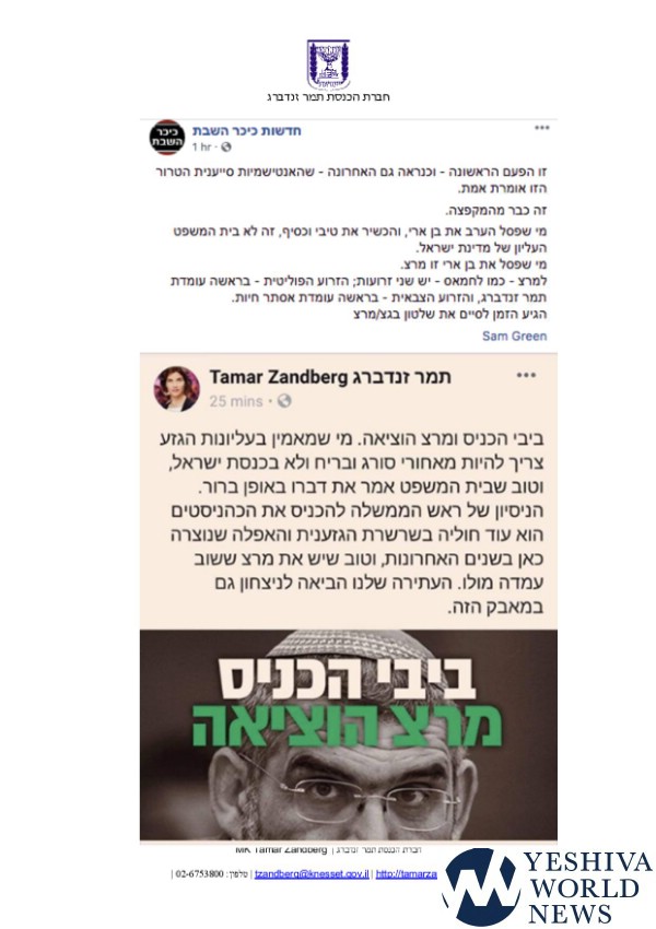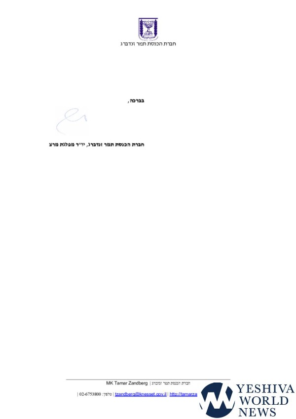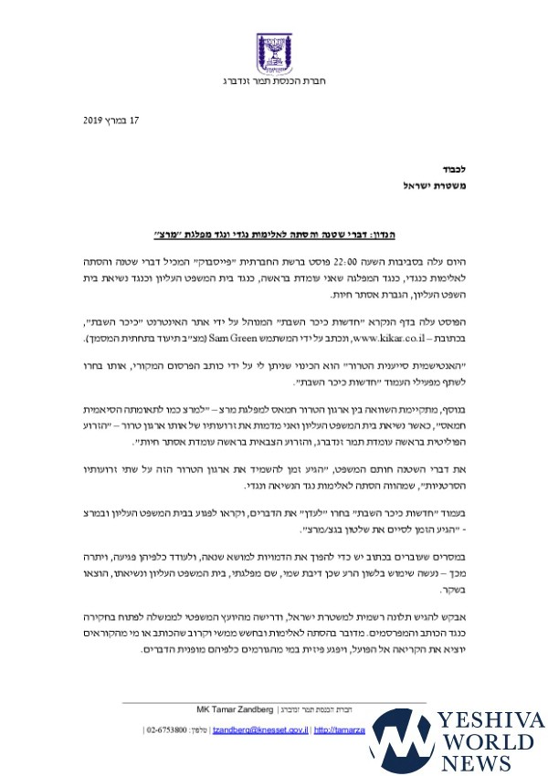 Meretz party Chairwoman MK Tamar Zandberg sent a letter to police, to the Knesset Officer, and Attorney General against the Kikar Shabbos website, which she stated compared Meretz to Hamas.