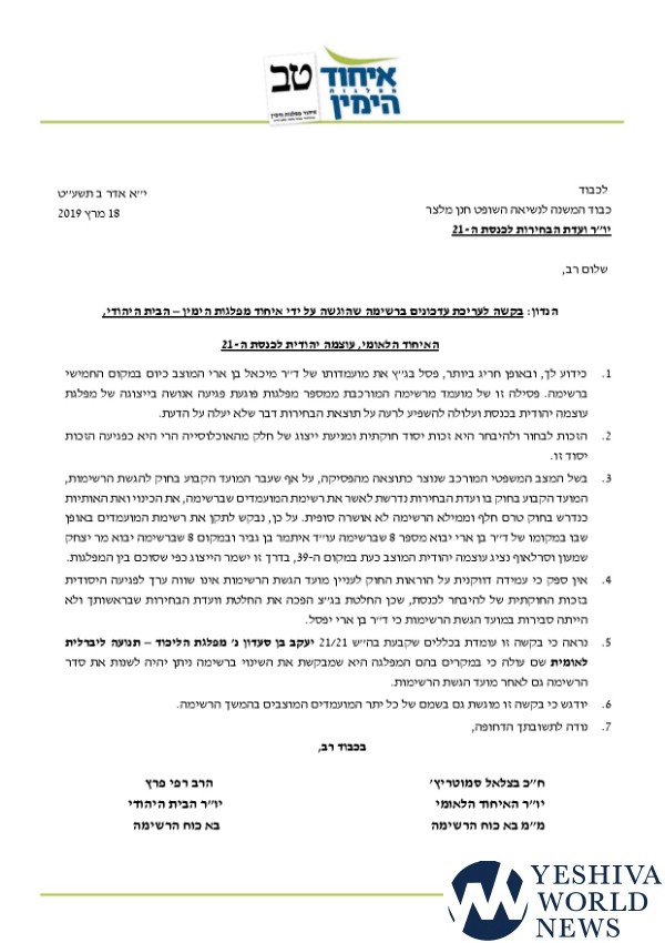 Hence, the letter points out that the request from Likud candidate Yaakov Ben-Ben-Sa’adon, representative of the Shvelah region, received the 19th spot on the Likud list in place of Pinchas Idan who left the race. The election committee rejected Ben-Sa’adon’s request and he then petitioned the court, and a ruling is pending.