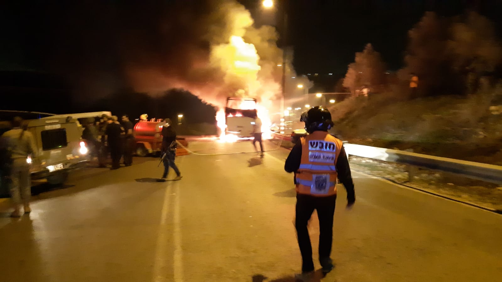 UH volunteers responded to an emergency involving a firebomb that was thrown at a bus near the Git intersection in Samaria. UH first responders who arrived at the scene reported that the driver of the bus was uninjured and claimed that there were no other passengers on the bus. pic.twitter.com/wgXIcT3cII