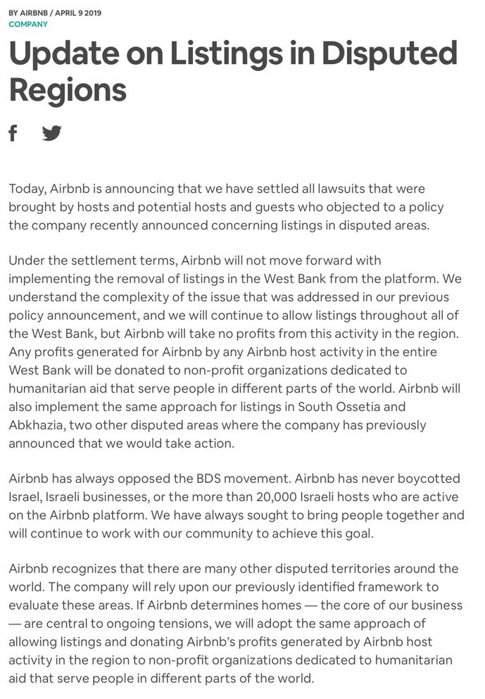 “Airbnb said it will now allow those properties to be listed, but will donate any of its profits from the West Bank to humanitarian aid organizations.”