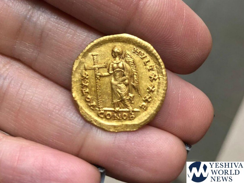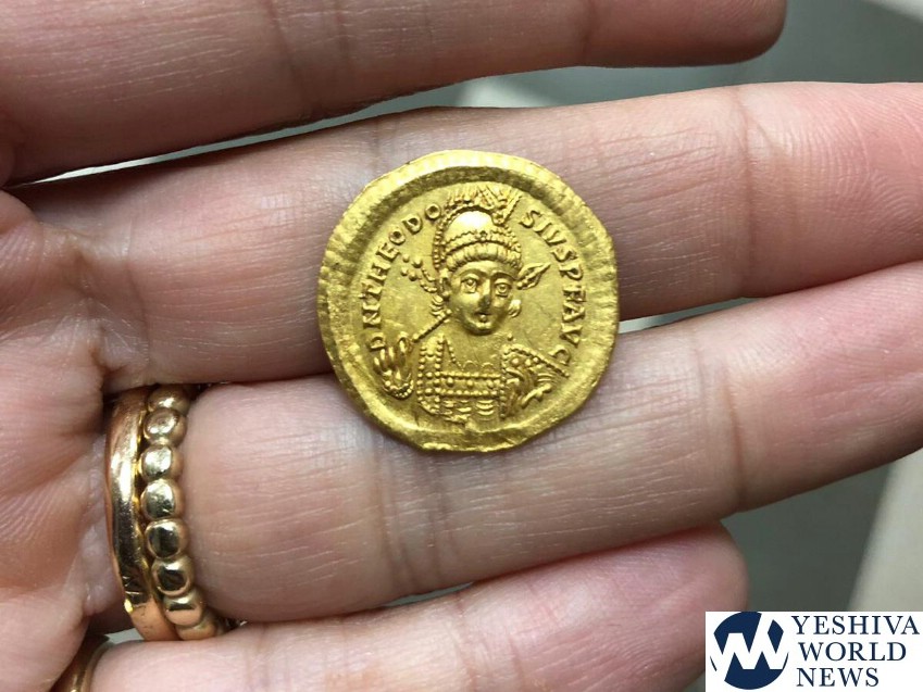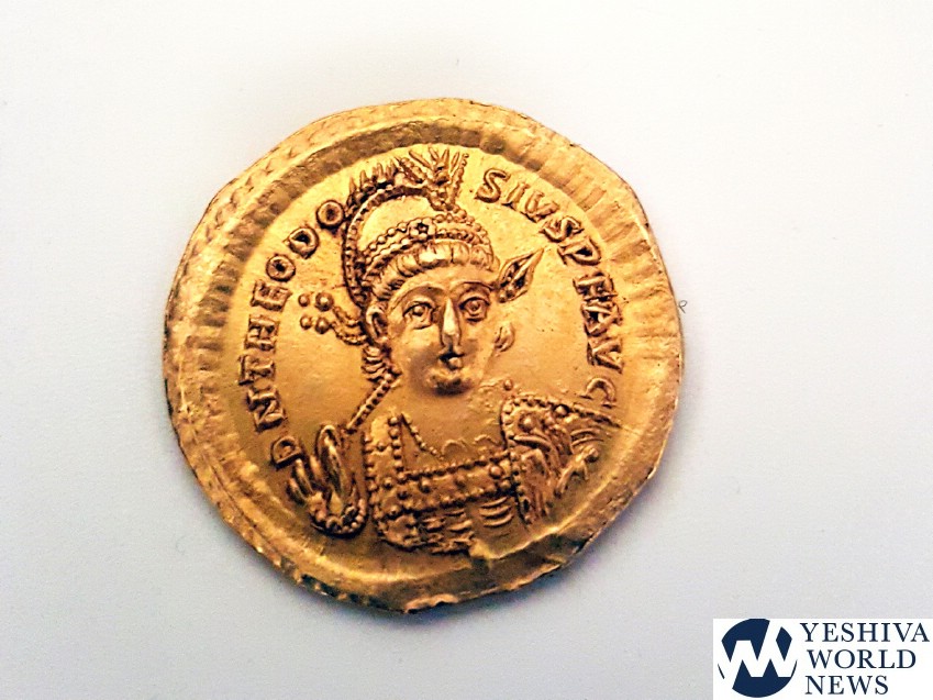 The coin, the first of its type discovered in Israel, was minted by the Byzantine Emperor Theodosius II, whose edicts led to the abolishment of the Sanhedrin Council and to the large-scale emigration of Jews to the Diaspora.