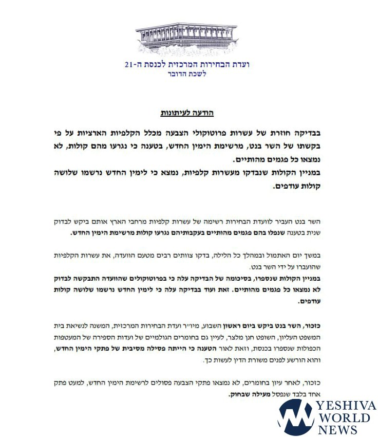 A week after the election for 21st Knesset, the Central Election Committee informed New Right Chairman Naftali Bennet the “there are no invalidated ballots”.