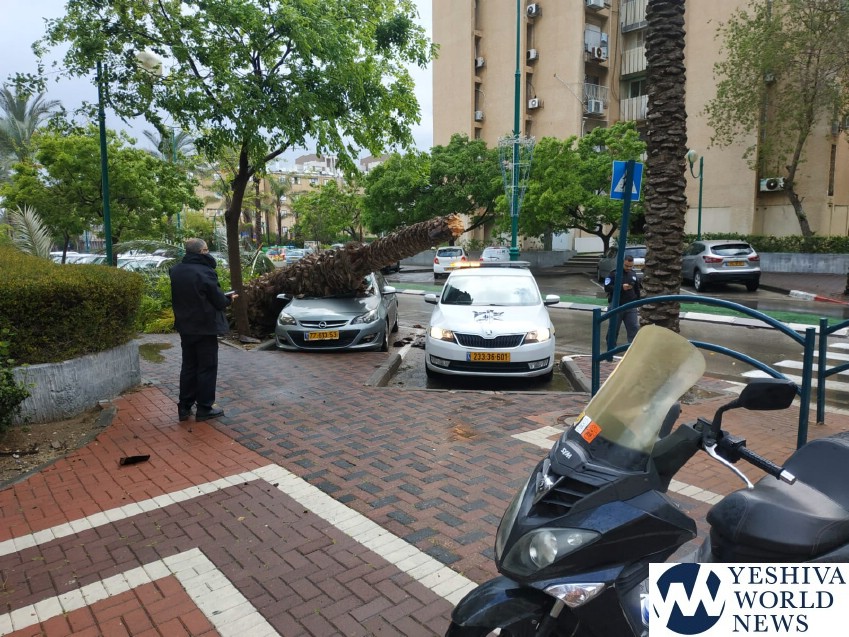 The unseasonal Pesach weather, including rainfall accompanied by strong winds, resulted in a palm tree collapsing on a parked vehicle in Jerusalem, at the corner of Ben Tzvi and Shazar Streets on Sunday, the first day of Chol Hamoed Pesach.