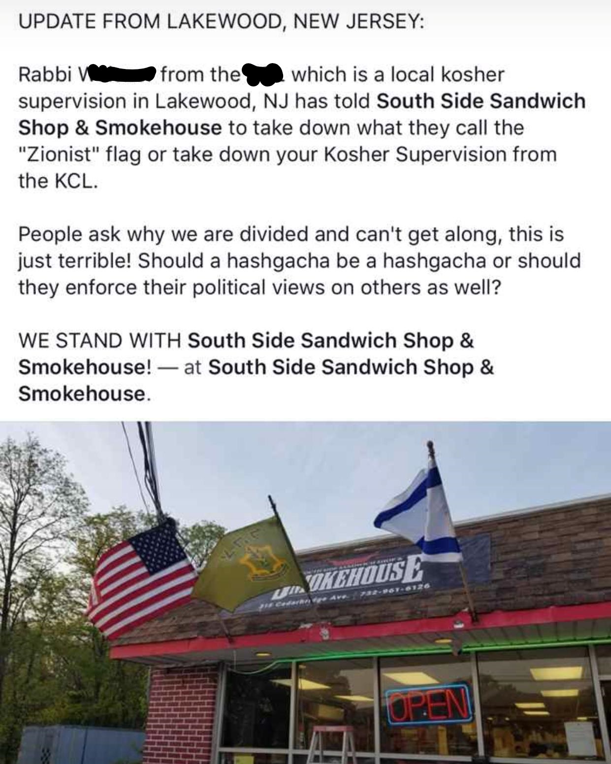 He was told that if he does not remove the “Zionist” flag, he should remove the Kashrus certification off his wall.