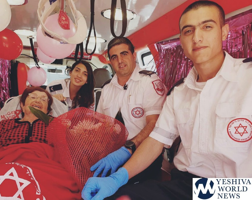 Diana Prechtman Berger from Hadera is taken three times a week to the hospital for dialysis treatment. MDA Senior EMT at the dispatch center Ronit Glula heard from Diana’a granddaughter that this week is her 81st birthday, and Ronit couldn’t stay indifferent to that fact. She decided, together with the EMS team, EMTs Rafael Buhadana, May Yevitz and Saadi Bashar who assist Diana on a regular basis, to surprise her on Tuesday on a very emotional and non-routine ride to the hospital with balloons, decorations and a vase of flowers.