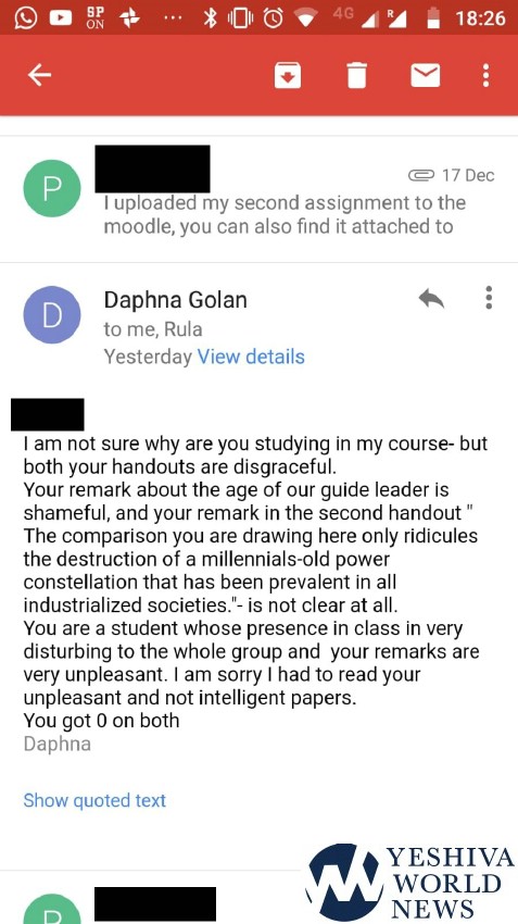 “I am not sure why you are studying in my course – but both your handouts are disgraceful,” read the email sent to the student by Golan.