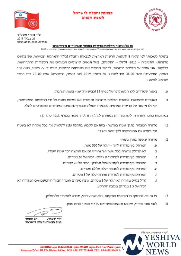 In the letter he writes that conditions that will increase the likelihood of fires compel the decision pertaining to starting bonfires from Wednesday, May 22, 2019 at 8:00AM up to and including May 24, 2019 at 8:00PM throughout Israel with the exception of: