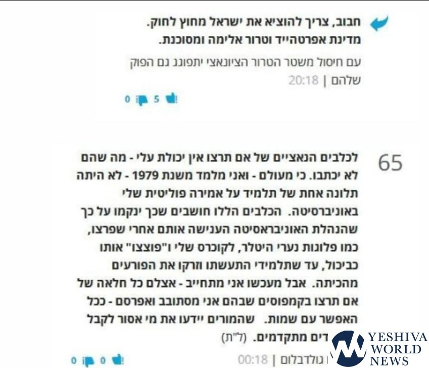 Professor Amiram Goldblum, a senior lecturer at Hebrew University, called student activists from the pro-Israel Im Tirtzu organization “Nazi dogs” and threatened to prevent them from getting accepted into advanced degrees, Makor Rishon newspaper reported.
