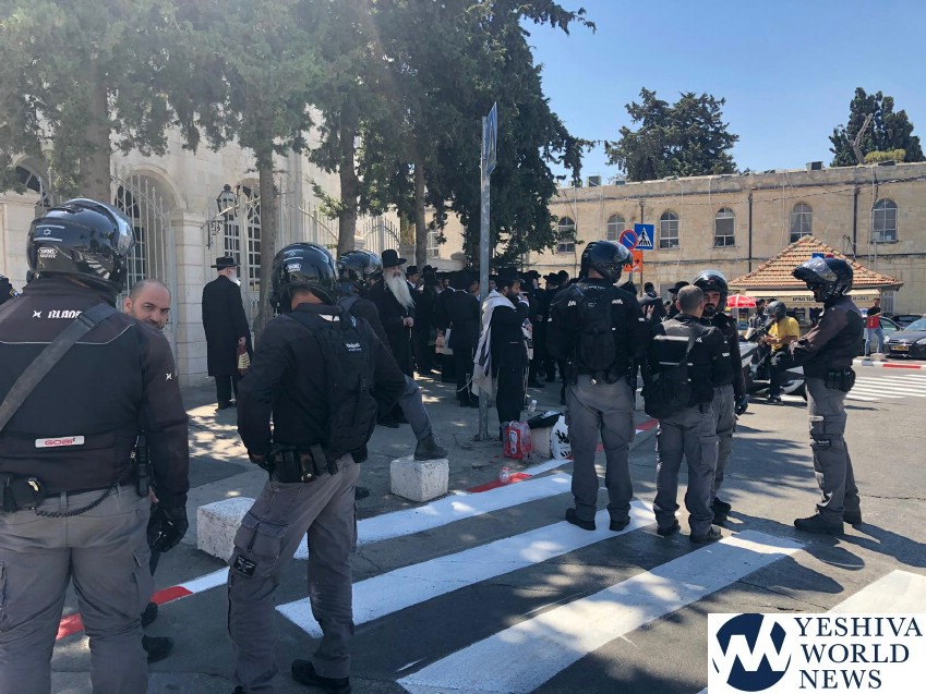 Five chareidi protestors were arrested/detained by police outside the Jerusalem Magistrate’s Court on Wednesday morning. The court session surrounding the arrests and detention of three women protestors outside the Jerusalem IDF Induction Center on Rashi Street earlier this week was taking place at the time of the protest.
