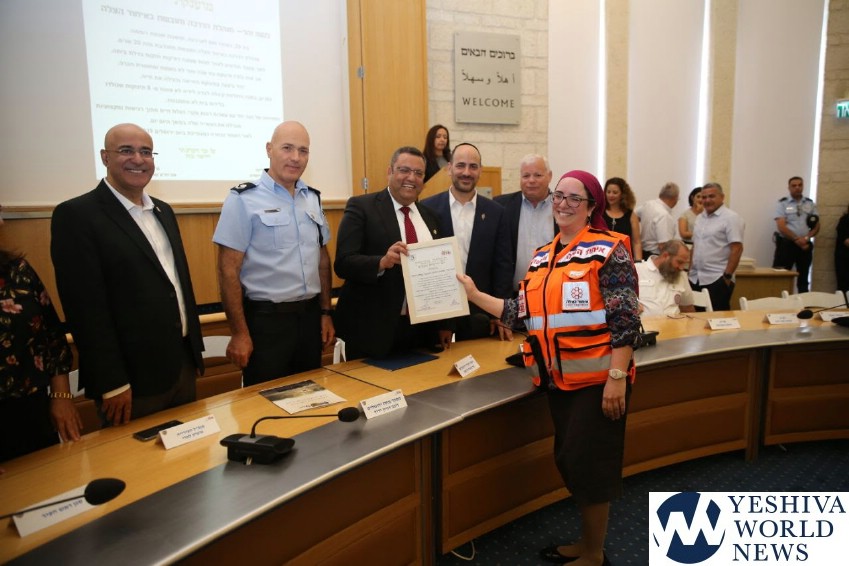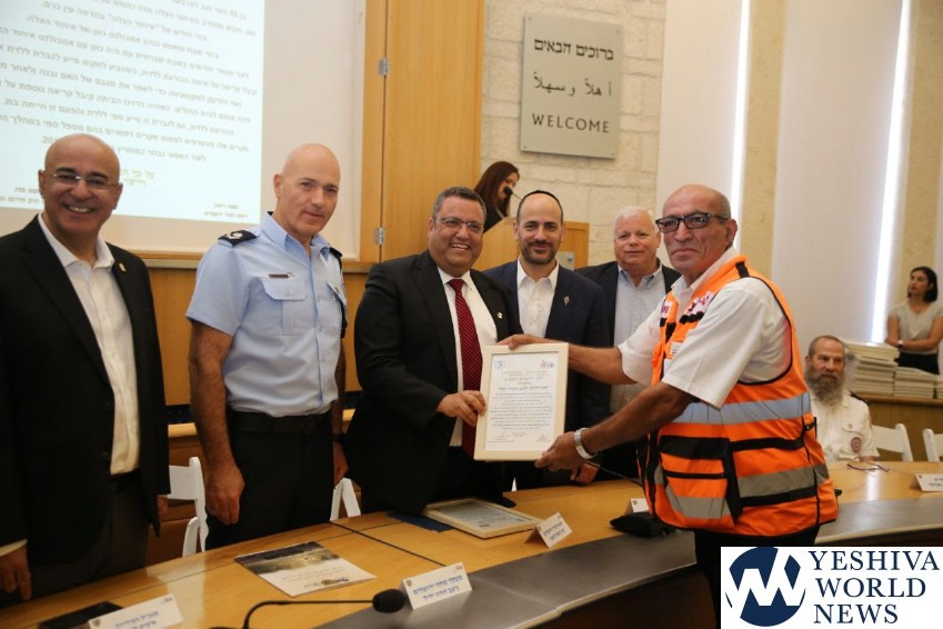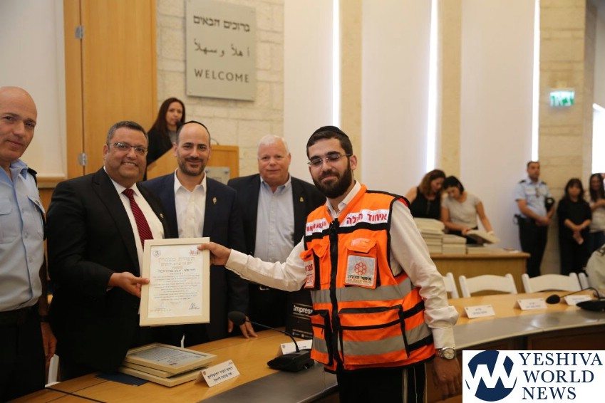 The Jerusalem Municipality honored exemplary first responders on Thursday, June 20, 2019, at a special ceremony that took place at City Hall. Among the honorees presented with citations from the city for their exemplary service were select volunteers from the police, fire department, ambulance organizations and the United Hatzalah EMS organization. Chosen from among the more than 400 United Hatzalah first responders in the city, four were chosen for having gone above and beyond the call of duty.