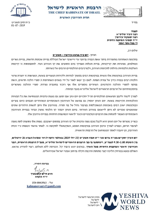 The Chief Rabbinate of Israel will be holding a seminar for the public on the topic of eruvs in light of increasing interest and questions regarding the status of an eruv in many areas, especially with the considerable amount of construction taking place; including new bridges, interchanges, tunnels, and more, with much of the said construction being relevant to an area’s eruv.