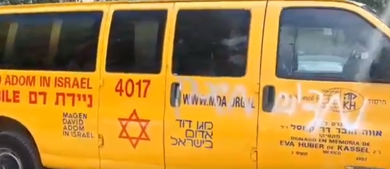 A Magen David Adom mobile blood bank was the target of a graffiti attack in Petach Tikvah.